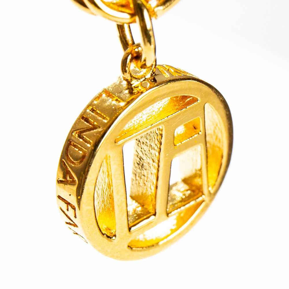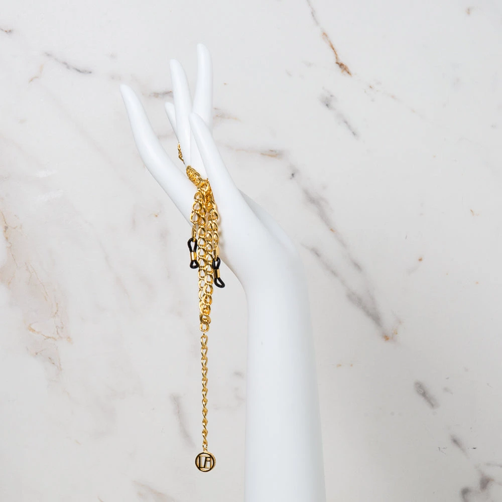 A classic eyewear accessory, this stylish fine chain is created in resiliant brass and plated in signature Linda Farrow yellow gold. Adjustable rubber hooks are fitted at each end, allowing the chain to be paired with any of our titanium or acetate frames. The chain is also finished with a chic drop pendant bearing our ‘LF’ initials.
