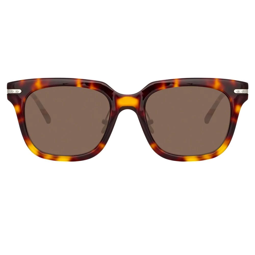 Classic tortoiseshell acetate, expertly polished, makes these chunky D-Frame sunglasses from the LINDA FARROW Linear collection an everyday classic. Fitted with solid brown lenses which harness ZEISS technology for a flawless lens with optimum clarity. The frame is complemented by custom-engineered titanium hinges and adjustable nose pads finished with 22 carat luna gold plating. This frame has been specifically designed with curved temples for an Asian fit. Also available in European fitting.