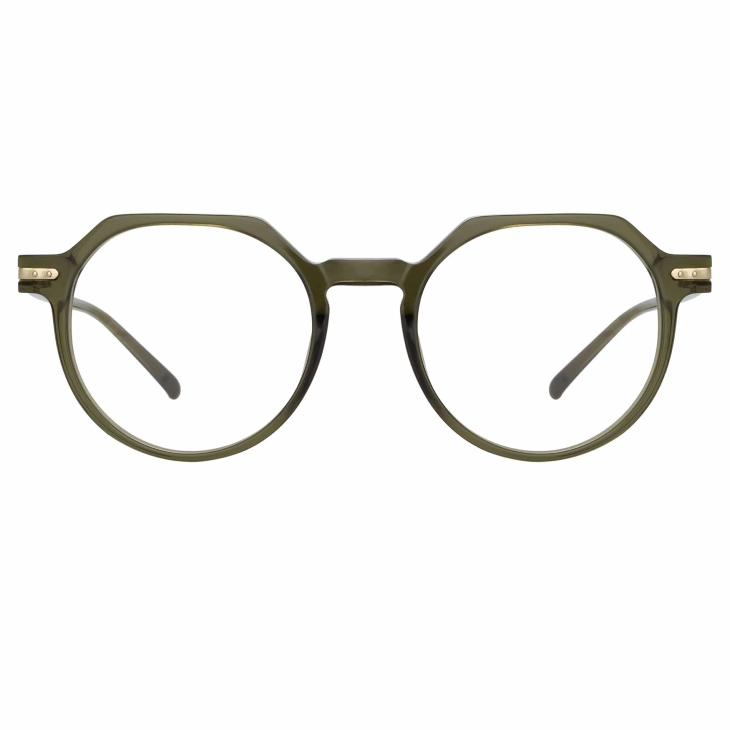 Inspired by architectural lines the Griffin optical frame from the LINDA FARROW Linear collection features a striking angular brow. The oval glasses are hewn from highly polished translucent green acetate with sculpted nose pads. The slim acetate temple is joined with a 22 carat light gold custom engineered titanium hinge with hidden ‘LF’ logo on the inside. Discreet logo detailing at the brow and a gold linear line running along the side of the rim complete the frame. Also available in Asian fitting.