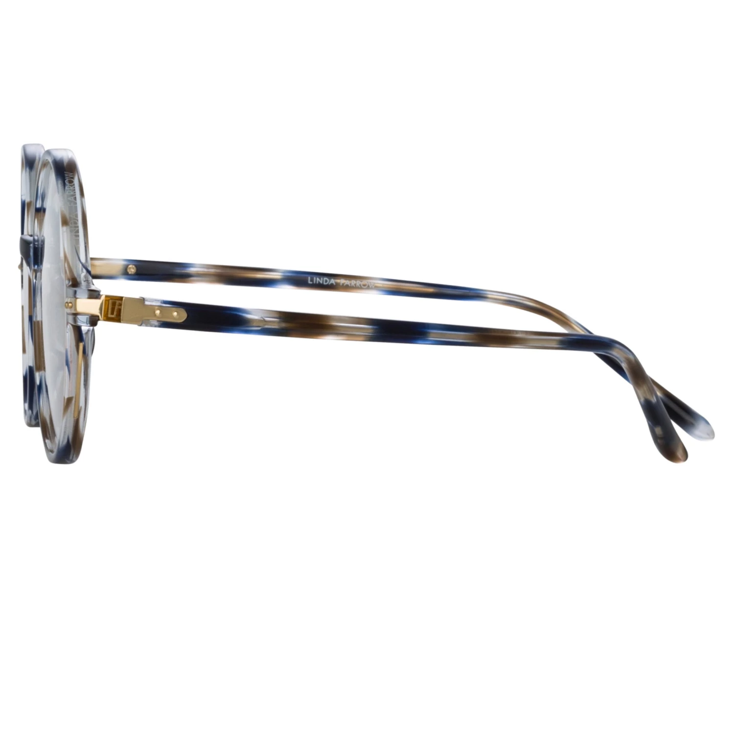 A modern classic these mid size round optical frames from the LINDA FARROW Linear collection are an everyday piece. Sculpted from blue tortoise shell acetate and teamed with laminated nose pads for a comfortable fit. Custom engineered 22 carat light gold plated hinges with a hidden ‘LF’ logo detail transition to sleek acetate temples. Subtle logo detailing at the brow, and a gold linear line running along the side of the rim complete the frame. Also available in Asian fitting.