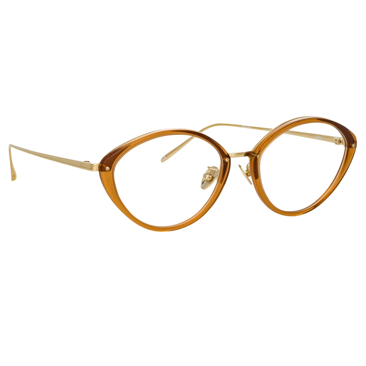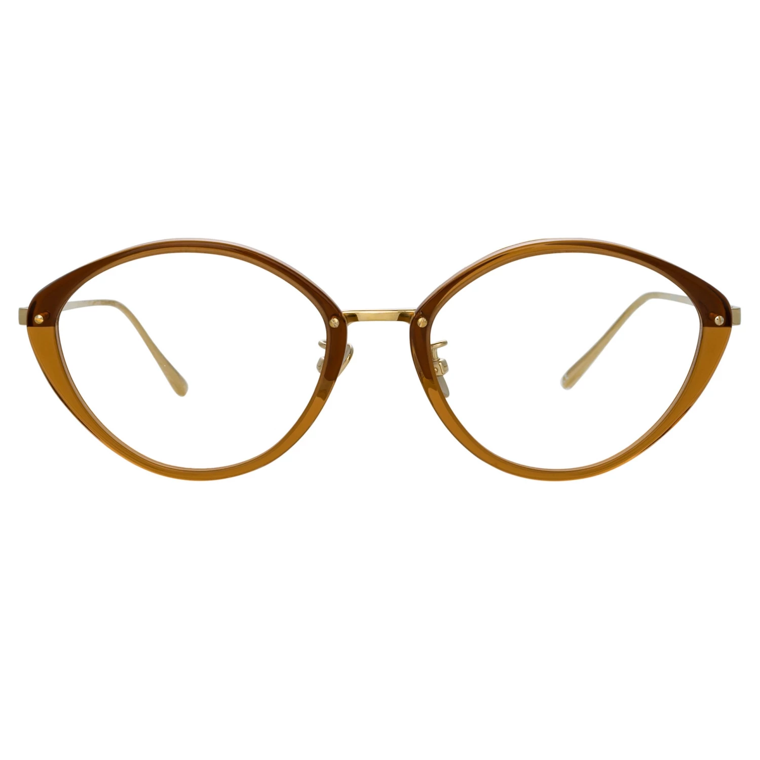These delicate cat eye optical glasses from the LINDA FARROW collection employ a signature design language of the brand. Expertly polished tobacco brown acetate rims are paired with a 22 carat light gold plated exposed titanium frame work running along the inner brow of the style. The sleek tapered temples and adjustable nose pads ensure a comfortable fit.