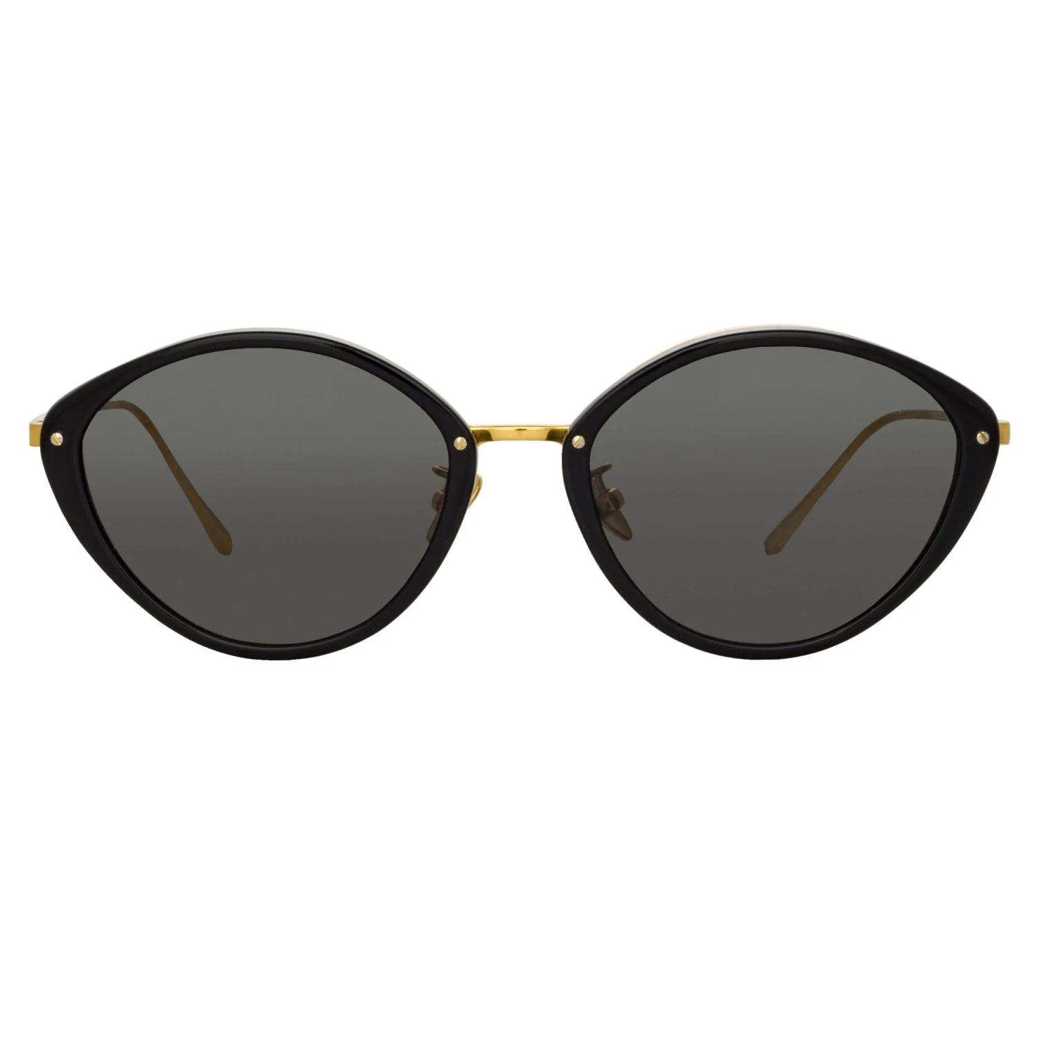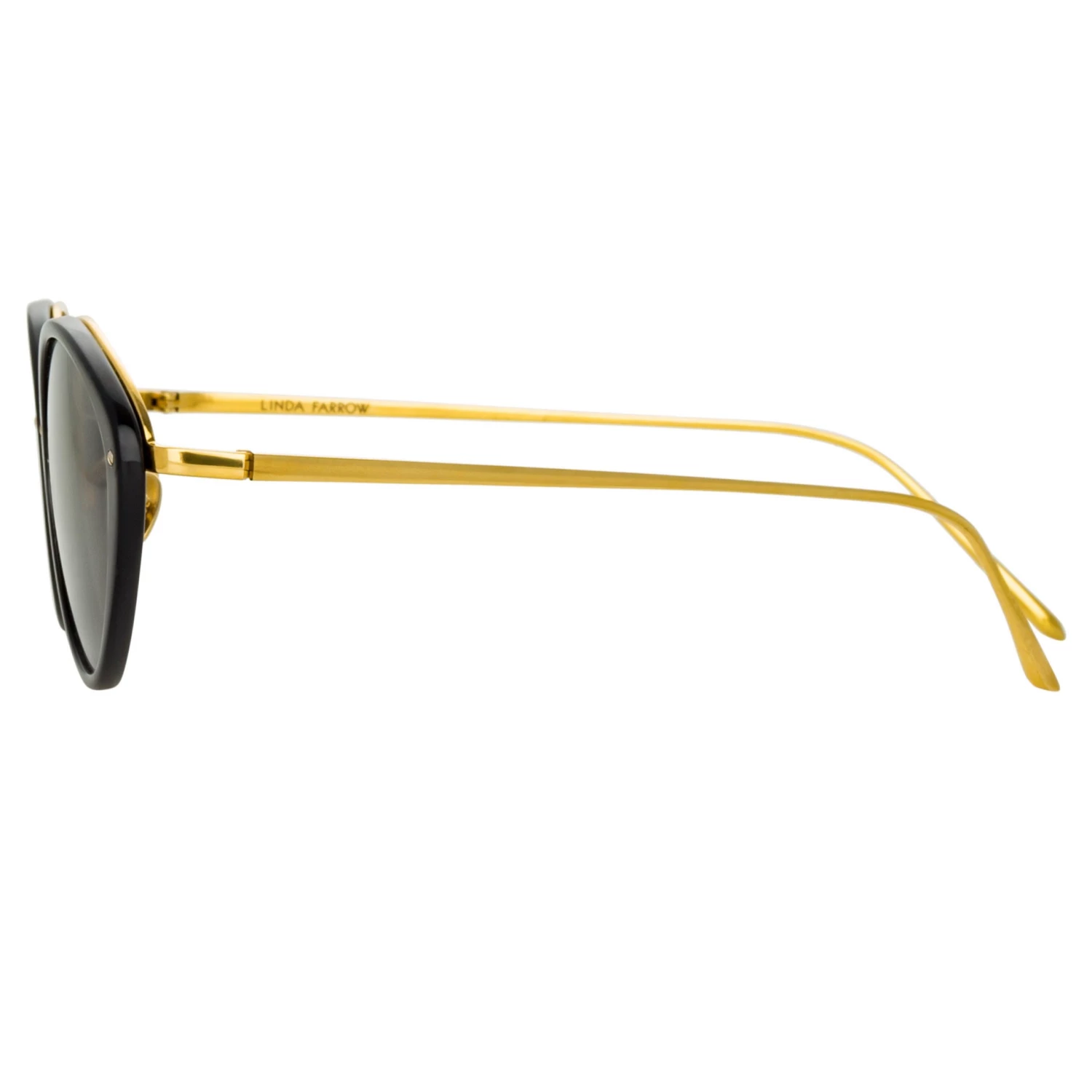 These delicate cat eye sunglasses from the LINDA FARROW collection employ a signature design language of the brand. Expertly polished recycled black acetate rims are paired with a 22 carat yellow gold plated exposed titanium frame work running along the inner brow of the style. The sleek tapered temples and adjustable nose pads ensure a comfortable fit. The frame is completed with solid grey ZEISS technology lenses for optimum clarity and UV protection.