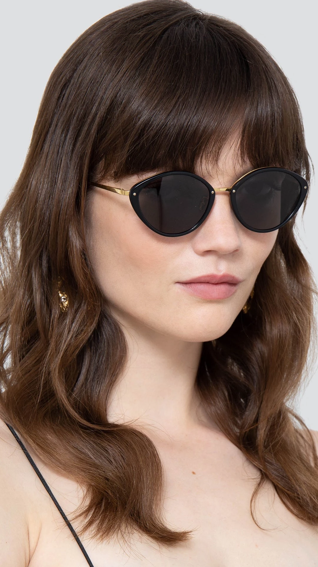 These delicate cat eye sunglasses from the LINDA FARROW collection employ a signature design language of the brand. Expertly polished optic white acetate rims are paired with a 22 carat light gold plated exposed titanium frame work running along the inner brow of the style. The sleek tapered temples and adjustable nose pads ensure a comfortable fit. The frame is completed with grey graduated ZEISS technology lenses for optimum clarity and UV protection.