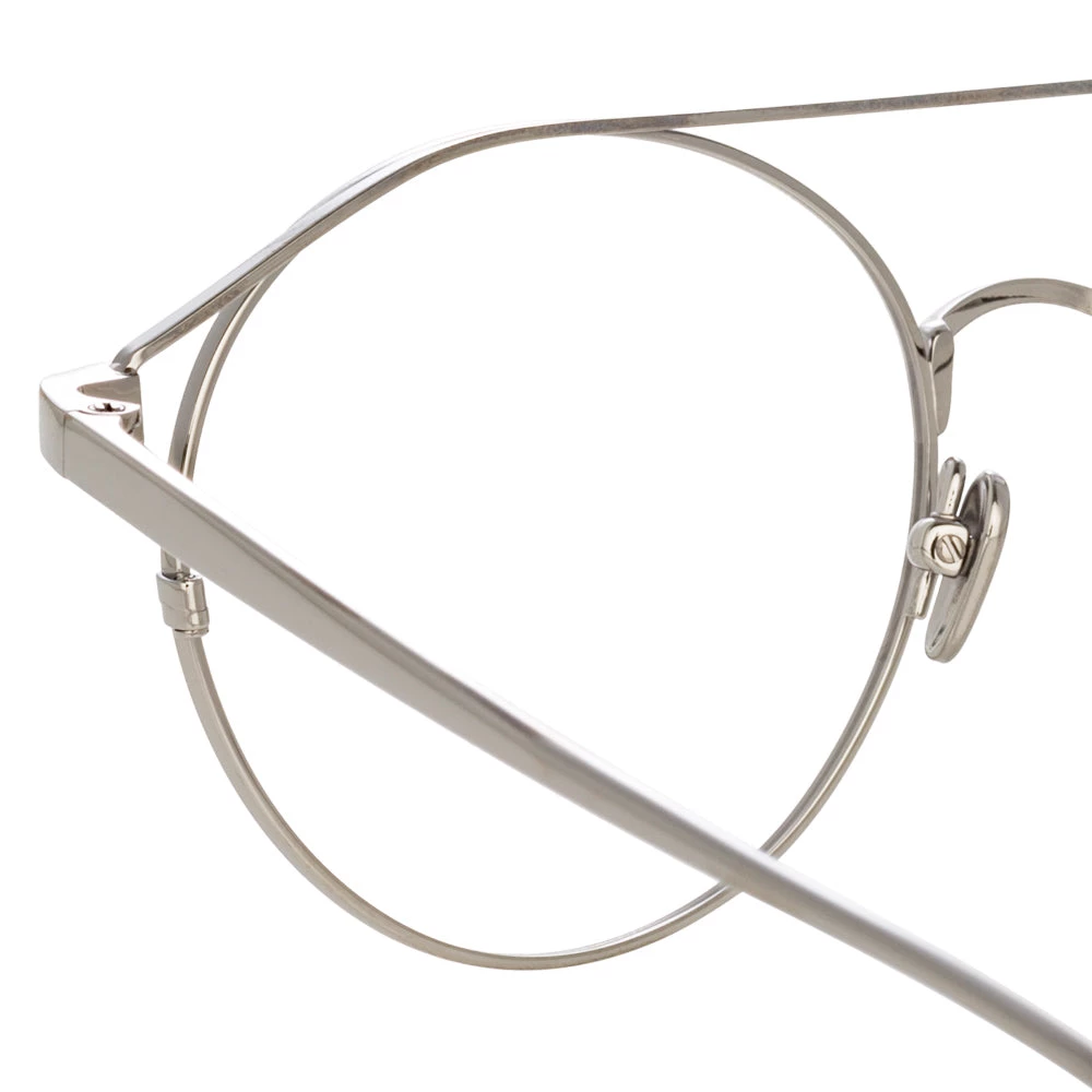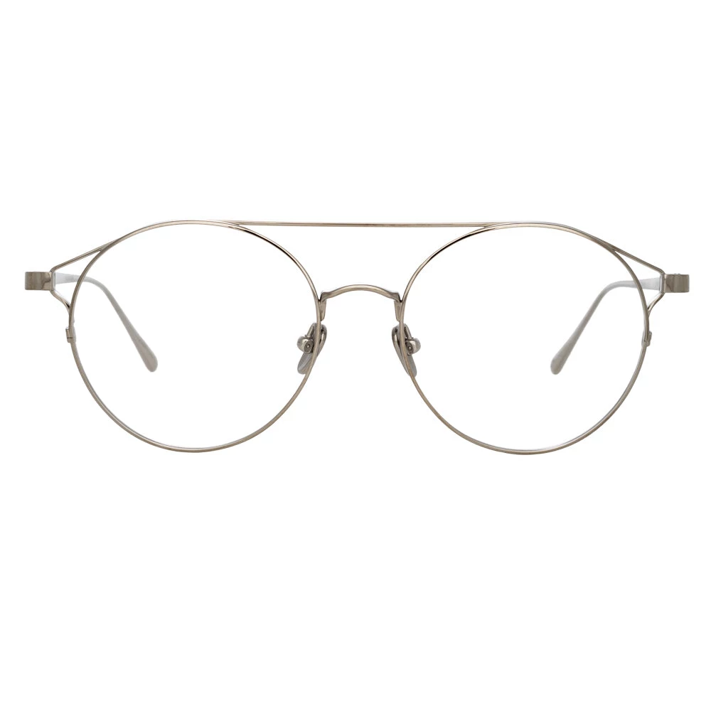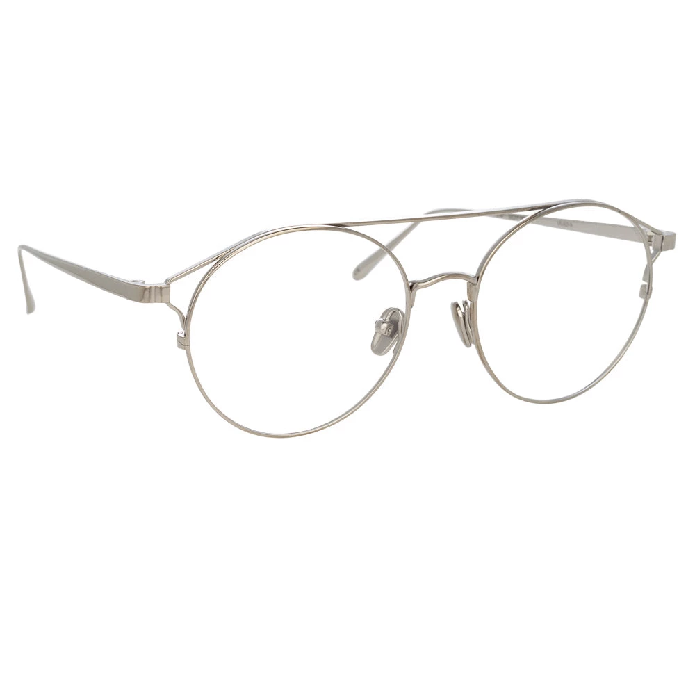 A hero in the Linda Farrow campaign, these unisex round aviator optical glasses are crafted entirely from white gold-plated ultra lightweight titanium. For a touch of unexpected luxe, the top bar of the frame extends out at the corners to create the illusion of negative space between the lenses.
