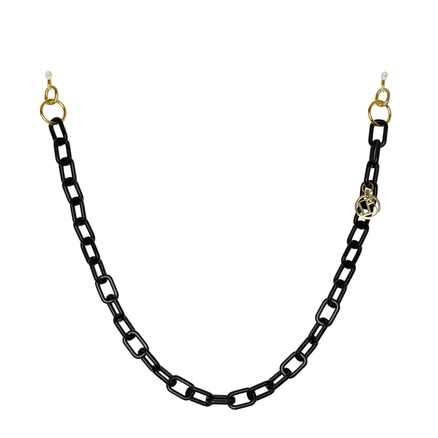 Pair your LINDA FARROW sunglasses with this glossy acetate chain for a statement look. Made from recycled black aceate the rounded square links are offset with our chunky gold plated monogram. Custom engineered clasps have been designed to clip through our signature eyelet temple. Also supplied with adjustable rubber loops which are compatible with all frames.