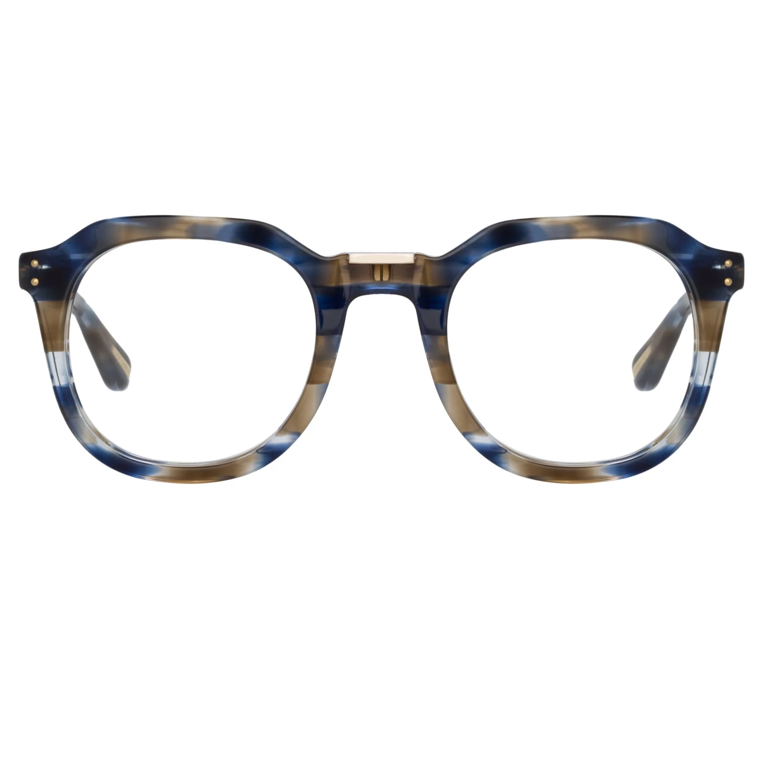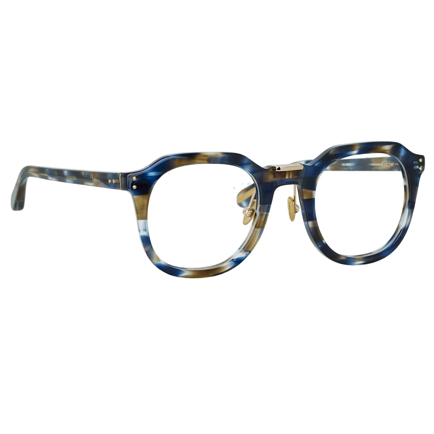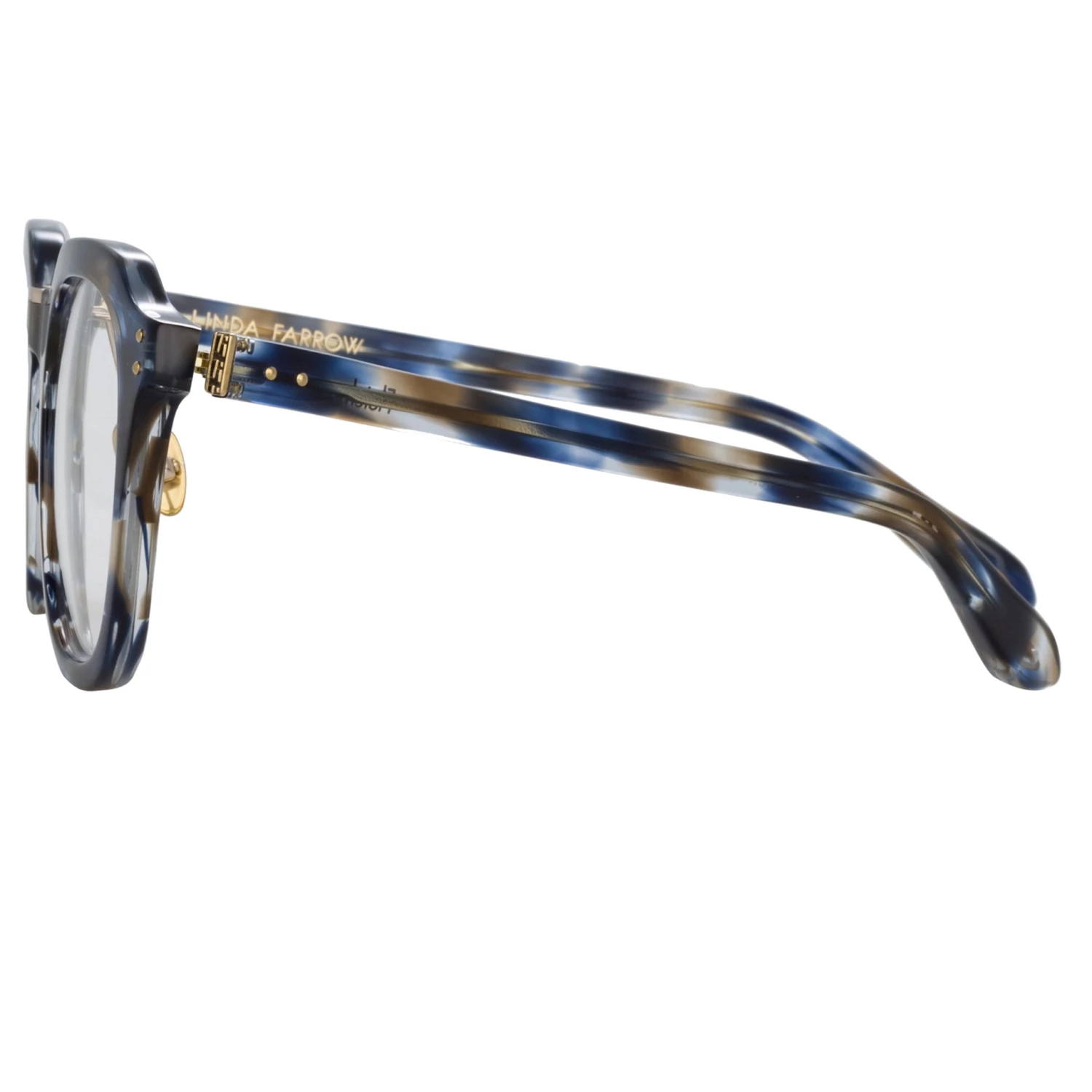The Fletcher from the LINDA FARROW collection employs subtle detailing to elevate and add intrigue. Introduced in a blue tortoise shell, the angluar acetate optical glasses are sculpted with their facets leading to a squared titanium bridge detail. The 22 carat light gold plated accet carries subtle logos and flows into adjustable nose pads for a comfortable fit. Beveled temples are competed with rounded tips which carry inset gold plated highlights.