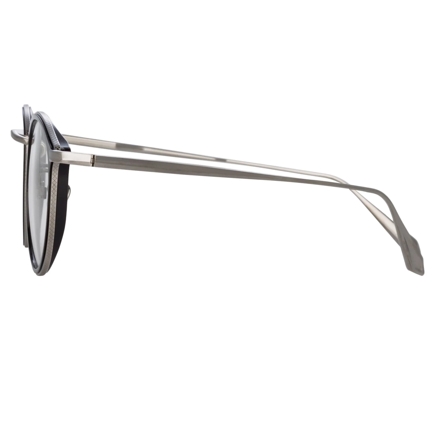 Layers of detail make up the striking form of this LINDA FARROW optical frame. The molded titanium eye rim graduates from thin to thick at the outer edge for added depth. The black painted rim is encircled with a contrasting 22 carat white gold plated titanium framework which is etched with a delicate criss cross pattern. The nose bridge bears a discreet logo and transitions to adjustable nose pads for a comfortable fit. Branded with our new signature temple which has been sculpted to take on a graduated form sweeping from hinge to tip. A concave outer tip detail is echoed by a rounded inner tip to provide superior comfort.