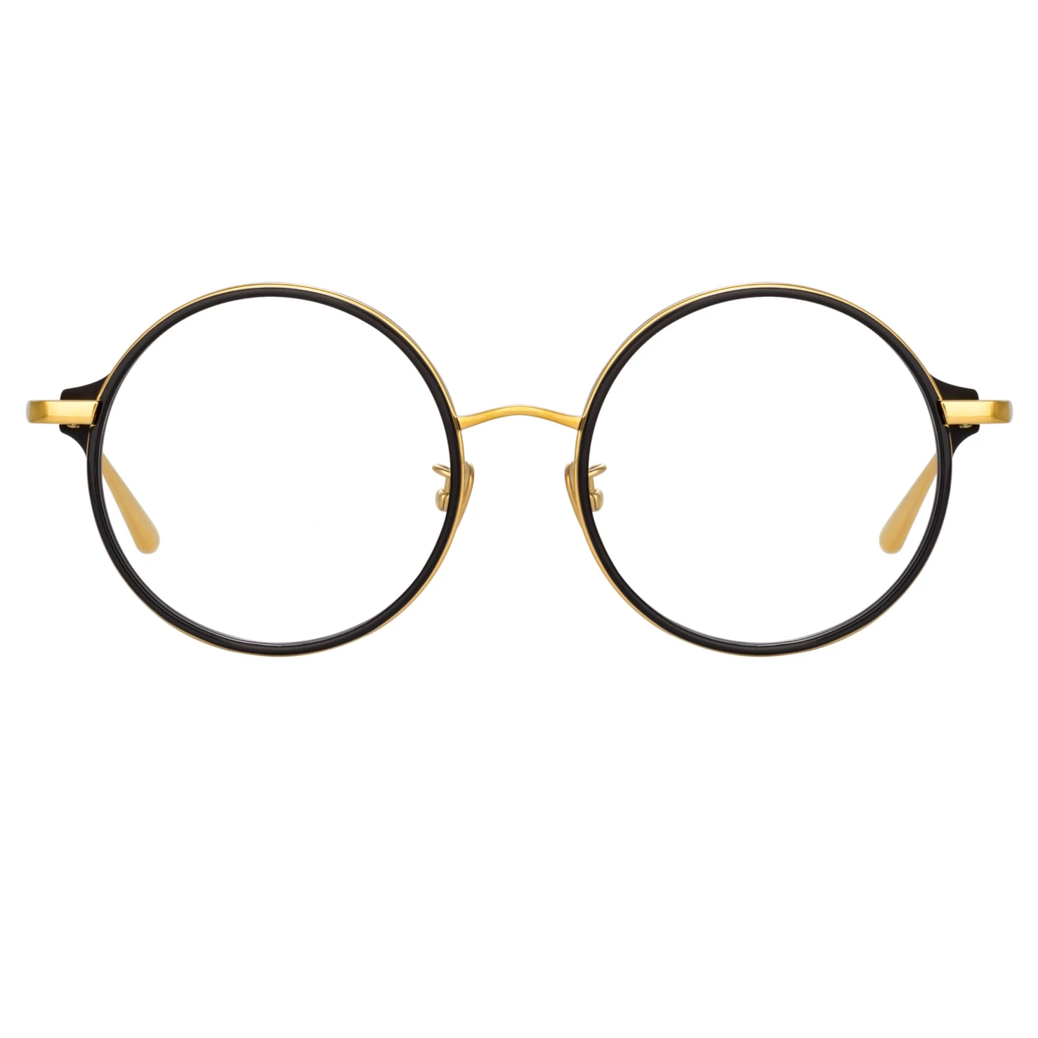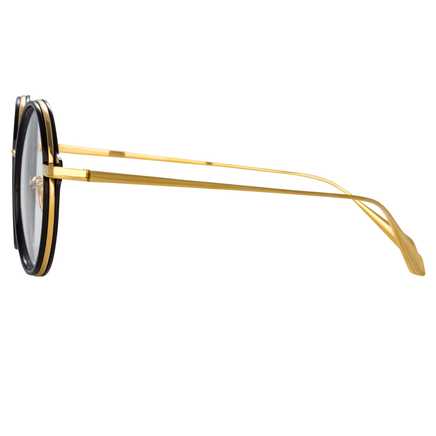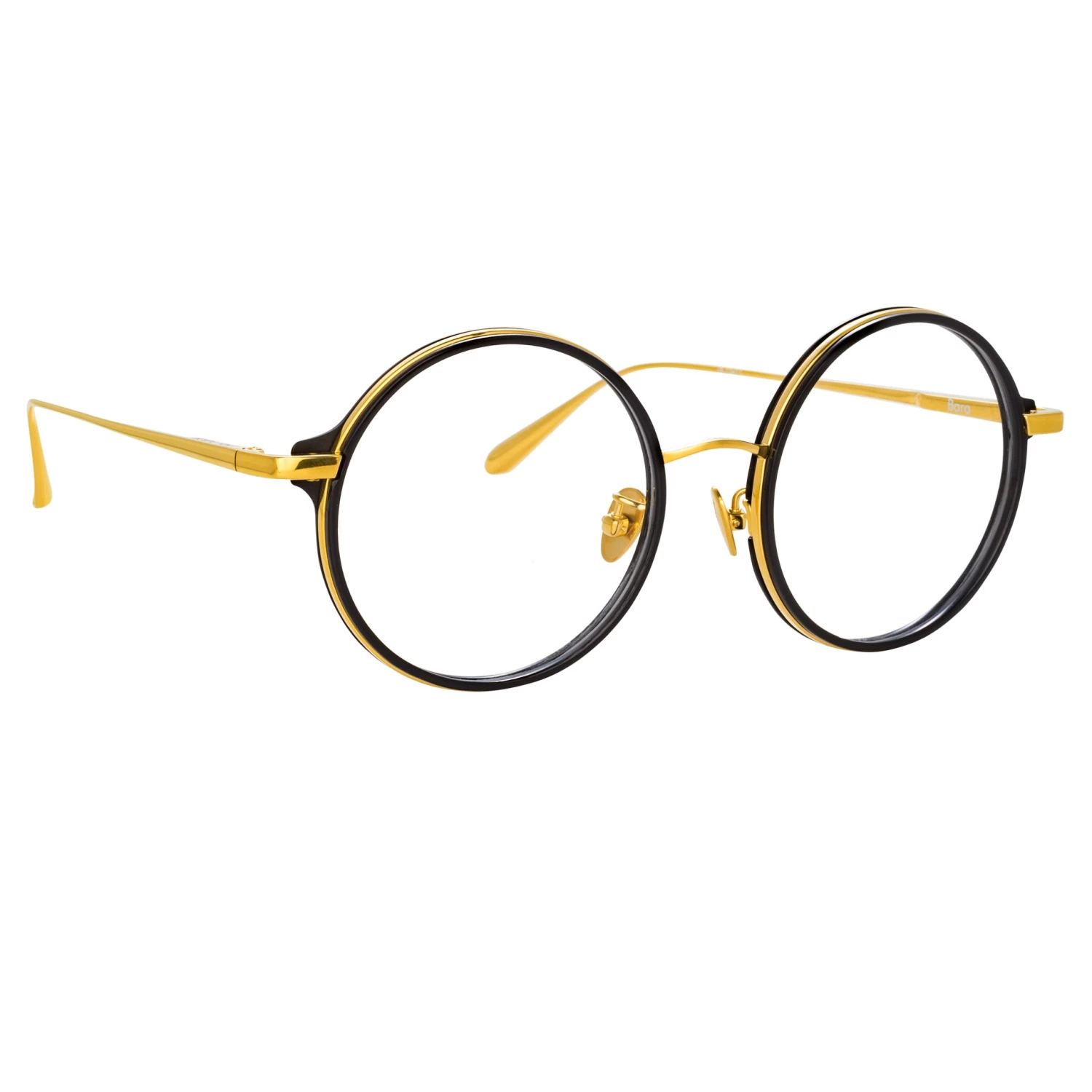 Delicately layered elements are combined to created these optical frames from the LINDA FARROW collection. Finely polished recycled black acetate rims are encircled by a 22 carat yellow gold plated titanium frame work. Fitted with our signature graduated temple and completed with adjustable nose pads for a comfortable fit.