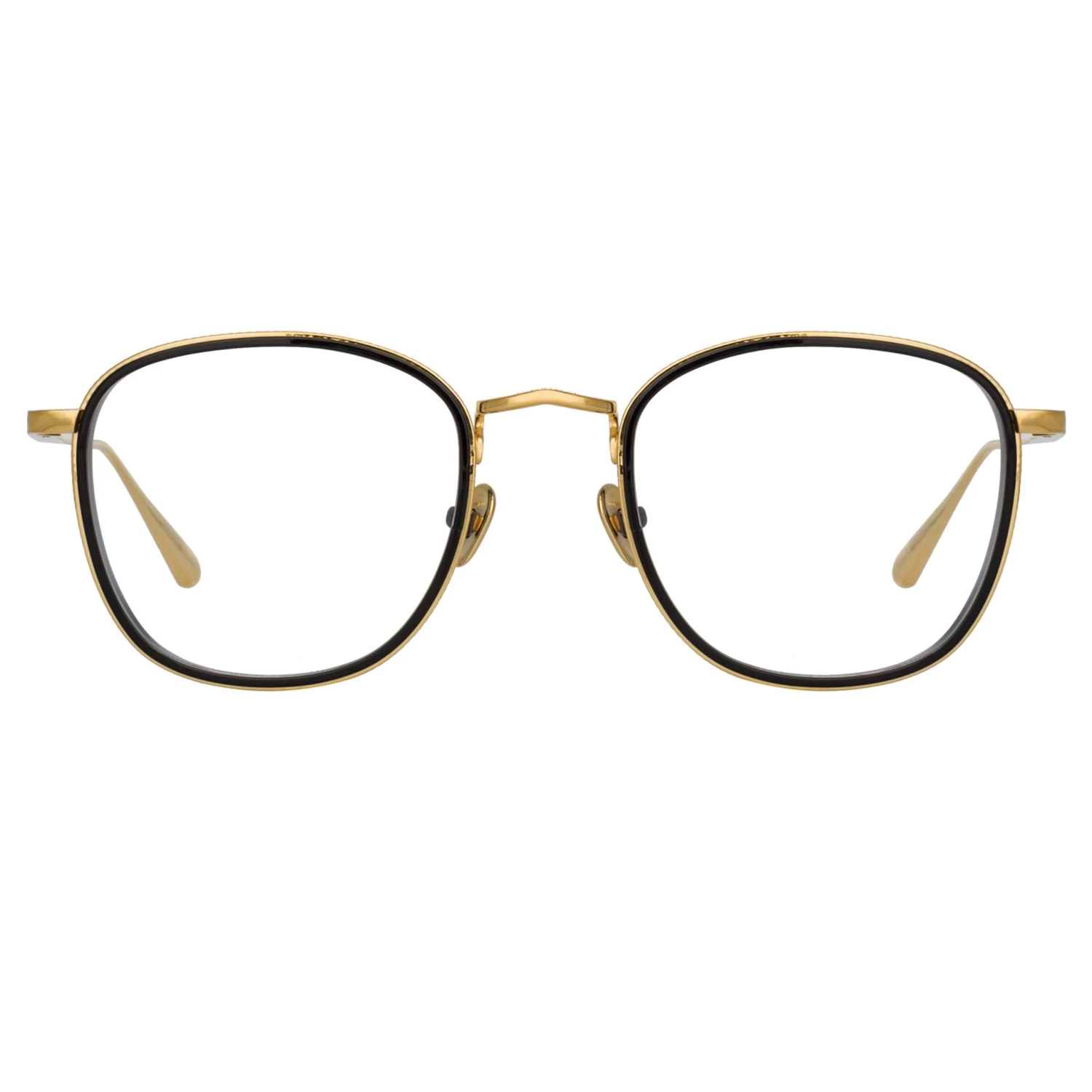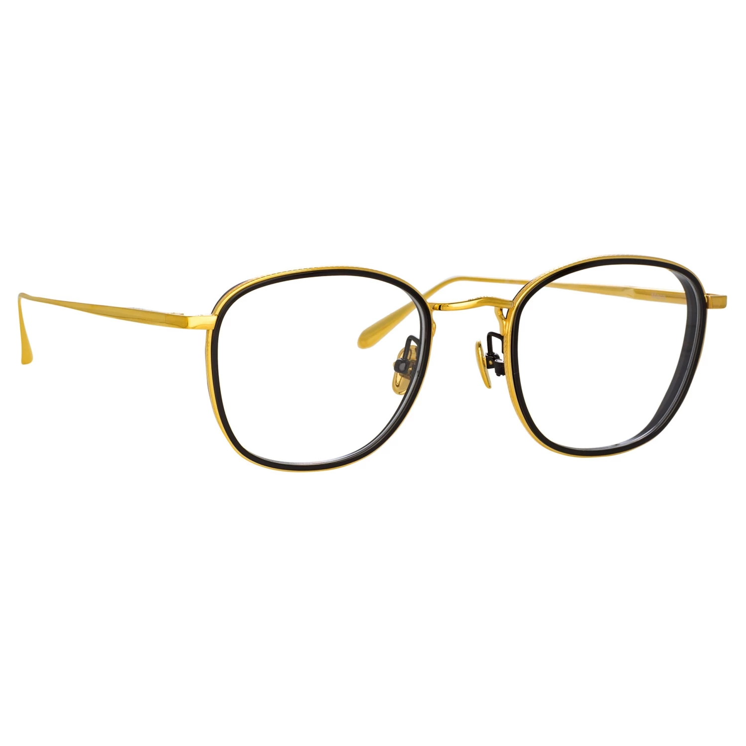LINDA FARROW explores the use of depth to elevate the form of this square optical frame. The Maco frame is sculpted from pure Japanese titanium, the inner eye graduating into a built up side detail. The shiny black frame is encircled by a 22 carat yellow gold plated rim etched with fine detailing. A discreetly logoed nose bridge transitions to adjustable nose pads for a tailored fit.