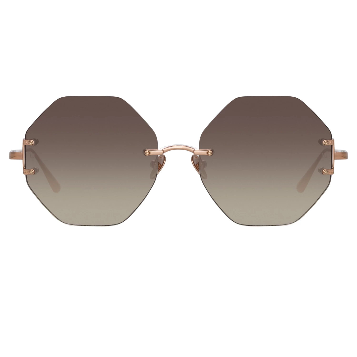 These hexagonal sunglasses from the LINDA FARROW collection cast an iconic 70s silhouette. The shape is formed from 3mm thick lenses expertly cut and hand polished for a glossy high shine edge. The rimless mocha gradient lenses are clasped in place with an intricate setting which folds over the outer edge. Engineered from 18 carat rose gold plated titanium with etched detailing which transitions into our signature graduated temple. A discreetly logoed nose bridge flows into adjustable nose pads for a tailored fit.