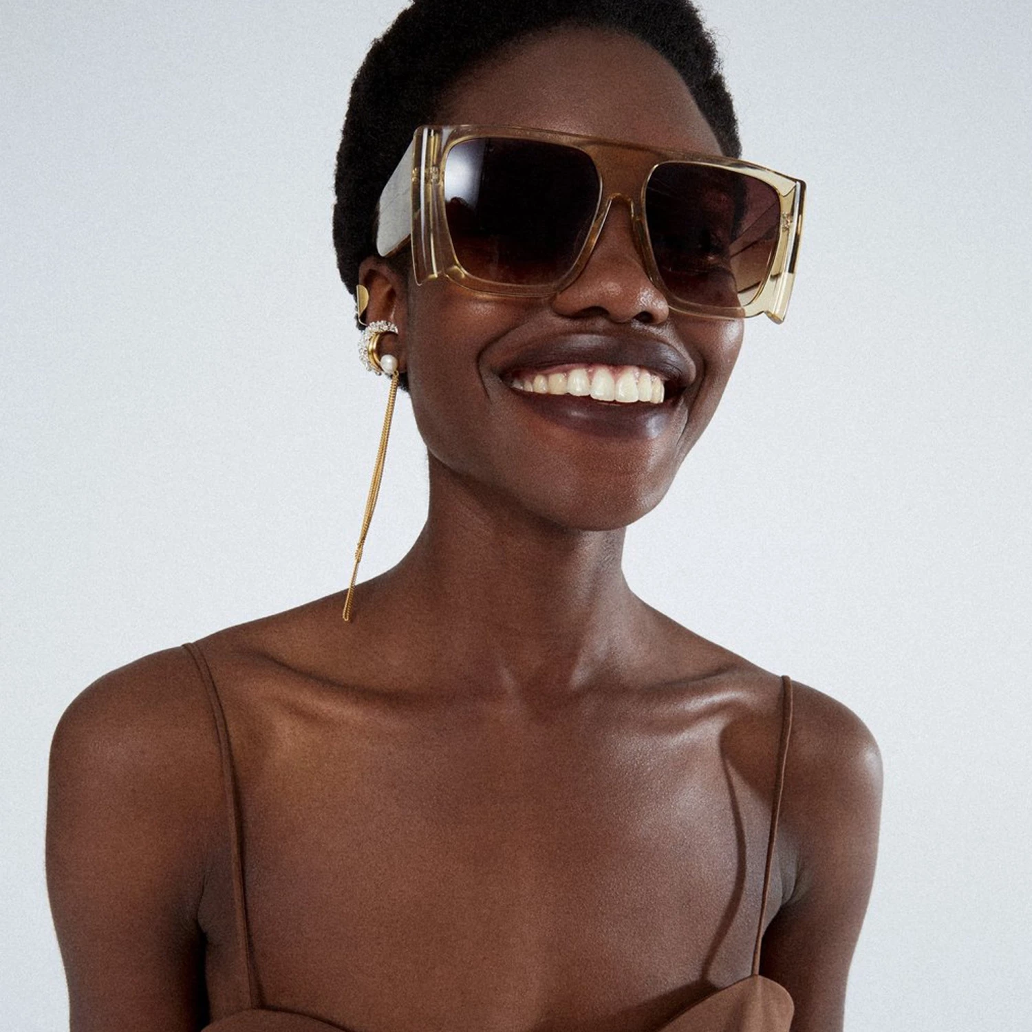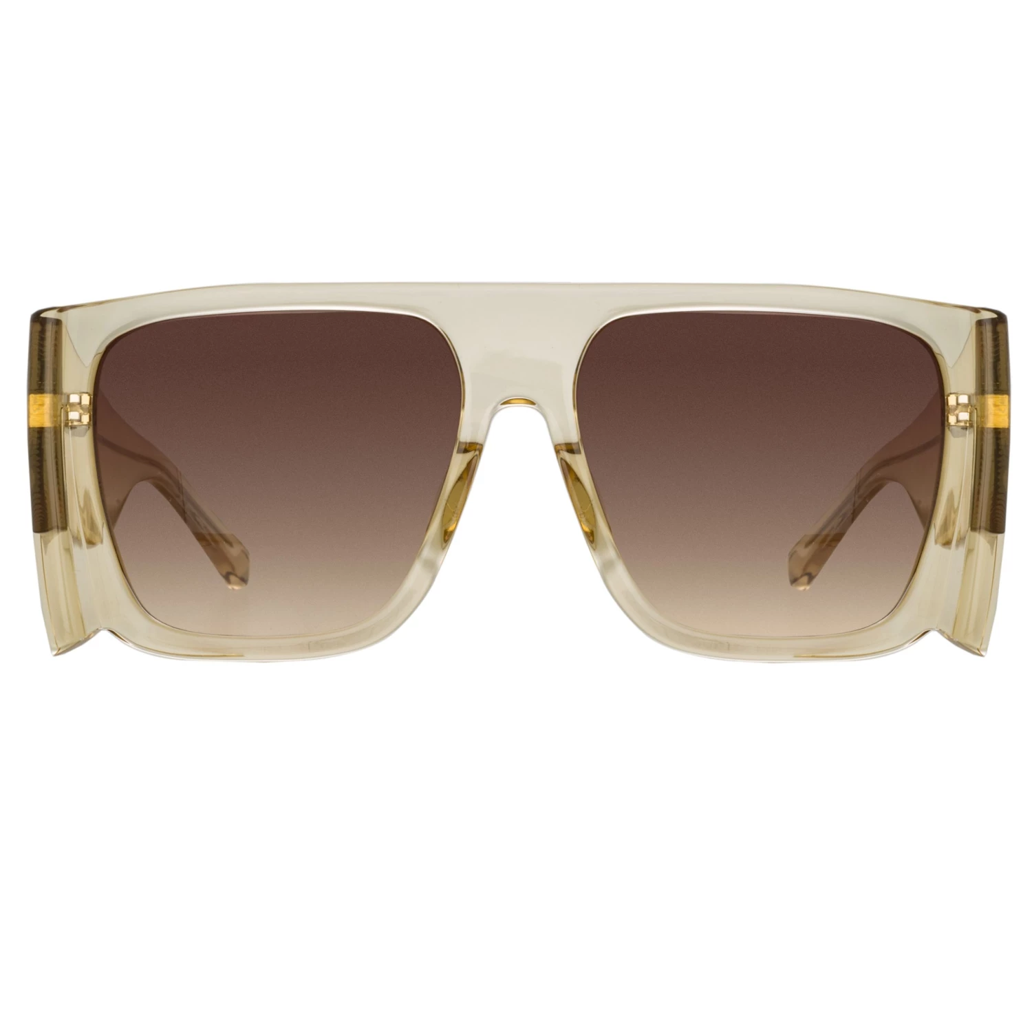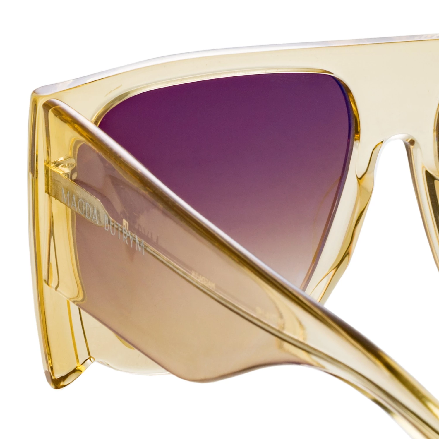 From our collaboration with MAGDA BUTRYM the ‘all eyes on me’ sunglasses are introduced in a new colour for spring. Formed from a translucent yellow acetate the flat top silhouette has highly bevelled detailing at the edge. Sculpted nose pads and temple tips ensure a comofortable fit. The pale yellow acetate is teamed with a warm brown graduated lens offering optimum clarity and 100% UV protection. Finished with logo detailing to the temple.
