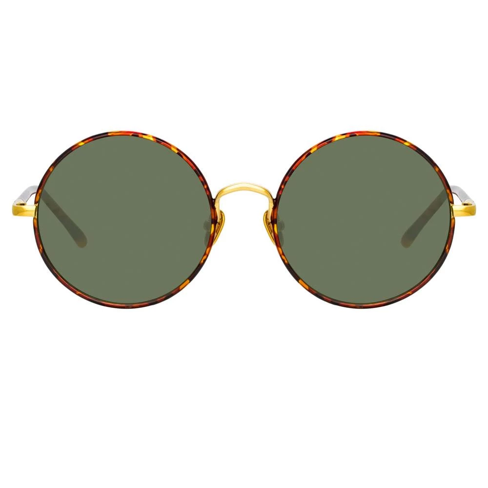 These masterfully crafted round sunglasses from the LINDA FARROW collection are a modern classic. The frame has been engineered from 22 carat yellow gold plated titanium which is contrasted beautifully with a rich tortoise shell pattern rim. The style is paired with expertly polished rounded tortoise shell acetate temples and solid green ZEISS lenses chosen for their superior durability. Welch is finished with adjustable titanium nose pads for a comfortable fit.