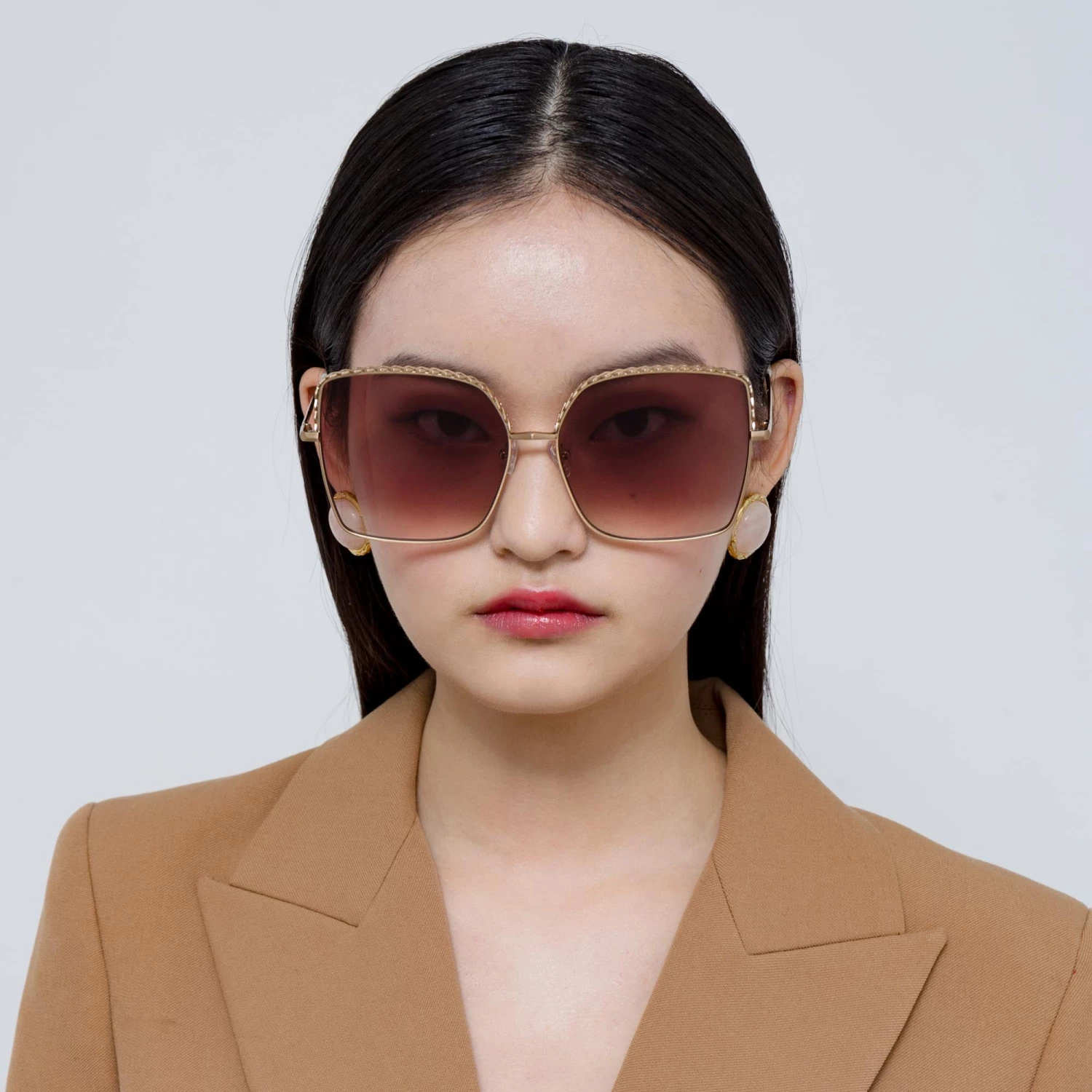 From our collaboration with MATTHEW WILLIAMSON these sunglasses make a statement. The oversized square silhouette is outlined with a layered metal brow detail. The light gold tone frame is contrasted with pink acetate temple tips inset with hexagon stud branding. The style is fitted with brown graduated lenses and completed with adjustable silicone nose pads for a comfortable fit.
