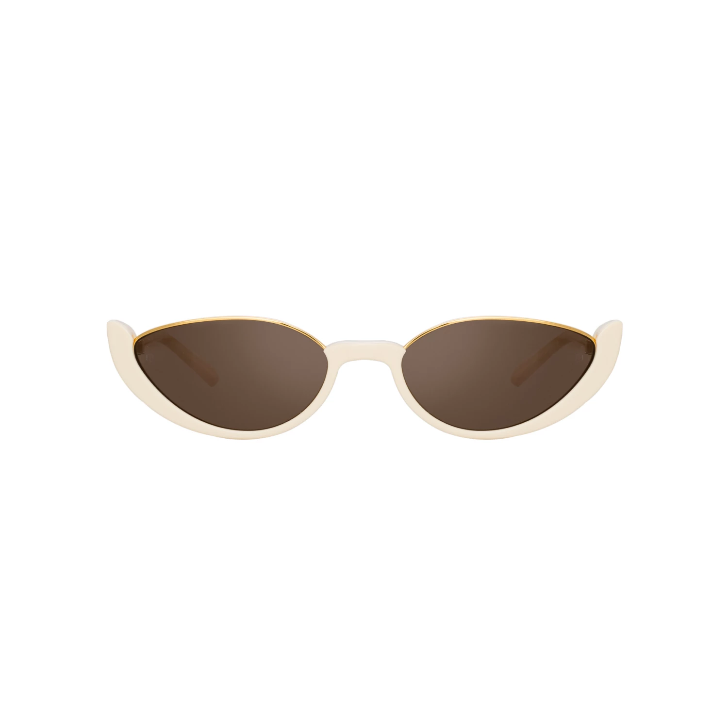 Forming part of the LINDA FARROW x RALPH & RUSSO collaboration, the Robyn exudes a refined glamour which is integral to both brands. The feminine cat eye sunglasses are sculpted from a cream Italian acetate which sweeps below the lens to form a delicate half rim, joined by a fine 22 carat yellow gold plated titanium running along the brow. The style is paired with solid brown nylon lenses which offer anti-glare and 100% UV protection. Sculpted nose pads and temple tips ensure a comfortable fit.